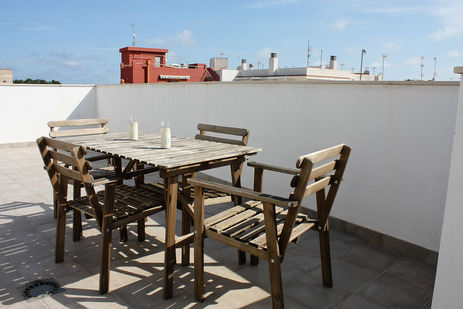 - Terraza con vistas a la playa y al castillo, equipada con mesa y sillas, toldo y tumbona.
